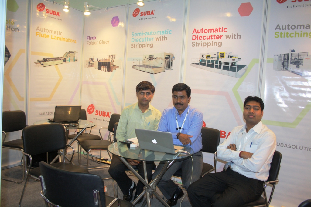 Chennai-based Suba Solutions introduced the flexo folder-gluer and flexo printer, slotter, and die-cutter series from Taiwan-based Lian Tiee Machinery; and automatic baling press from Techgene Machinery Co for the corrugating industry. According to Naresh (c) of Suba, Lian Tiee and Techgene are popular in the India and have couple of installations