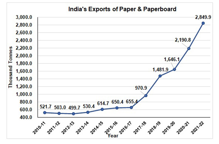 Paper exports from India have been looking up in the last five years. In volume terms, paper exports from India have gone up four times from 0.66 million tonnes in FY17 to 2.85 million tonnes in FY22. Similarly in value terms, the figures for corresponding years are Rs 3,041-crore to Rs 13,963-crore.