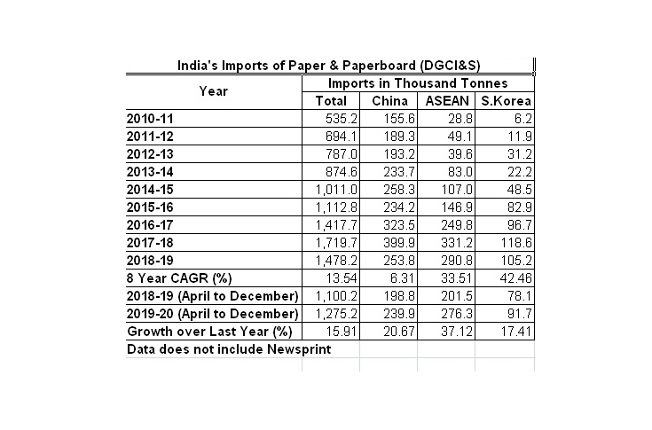 Paper and paperboard imports in the country have gone up by 16% in volume terms in Apr-Dec 2019-20 against the corresponding period of 2018-19. From an import of 11-lakh tonnes in April-December 2018, paper imports have risen to 12.75-lakh tonnes in April-December 2019. Import of paper from ASEAN region has risen at a faster rate of 37% during the nine-month period. ASEAN has come to account for the largest chunk of paper imports in the country.