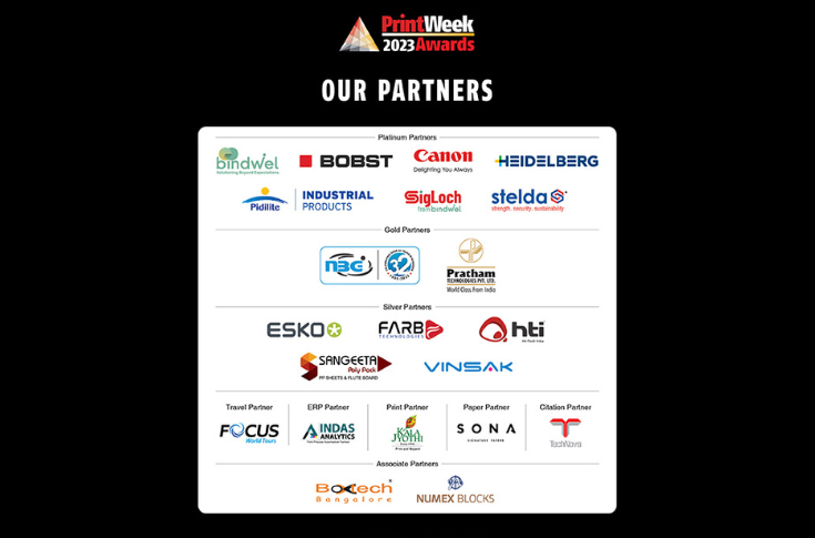 The PrintWeek Awards 2023 partners are Bindwel; Bobst India; Boxtech Bangalore; Canon India; Esko; Farb Technologies; Focus World Tours; Heidelberg India; Hi-Tech Inks; Indas Analytics; Kala Jyothi; NBG; Numex Blocks; Orient; Pidilite; Pratham Technologies; Sangeeta Poly Pack; SigLoch; Sona Papers; Stelda; TechNova; and Vinsak.