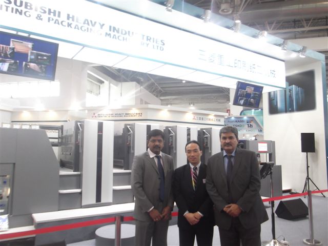 N Pradeep (l) and Vinay Kaushal (r) of Provin Technos, the Indian representative of Mitsubishi with Yasushi Miyamoto of Mitsubishi. The company showcased the Diamond V3000AS sheetfed press with mechanical type simultaneous plate-changer