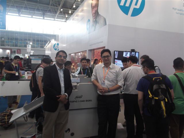 Anuj Mehta of Paper Bind along with a GMP representative, showcasing GMP's spot lamination machines at HP's stall