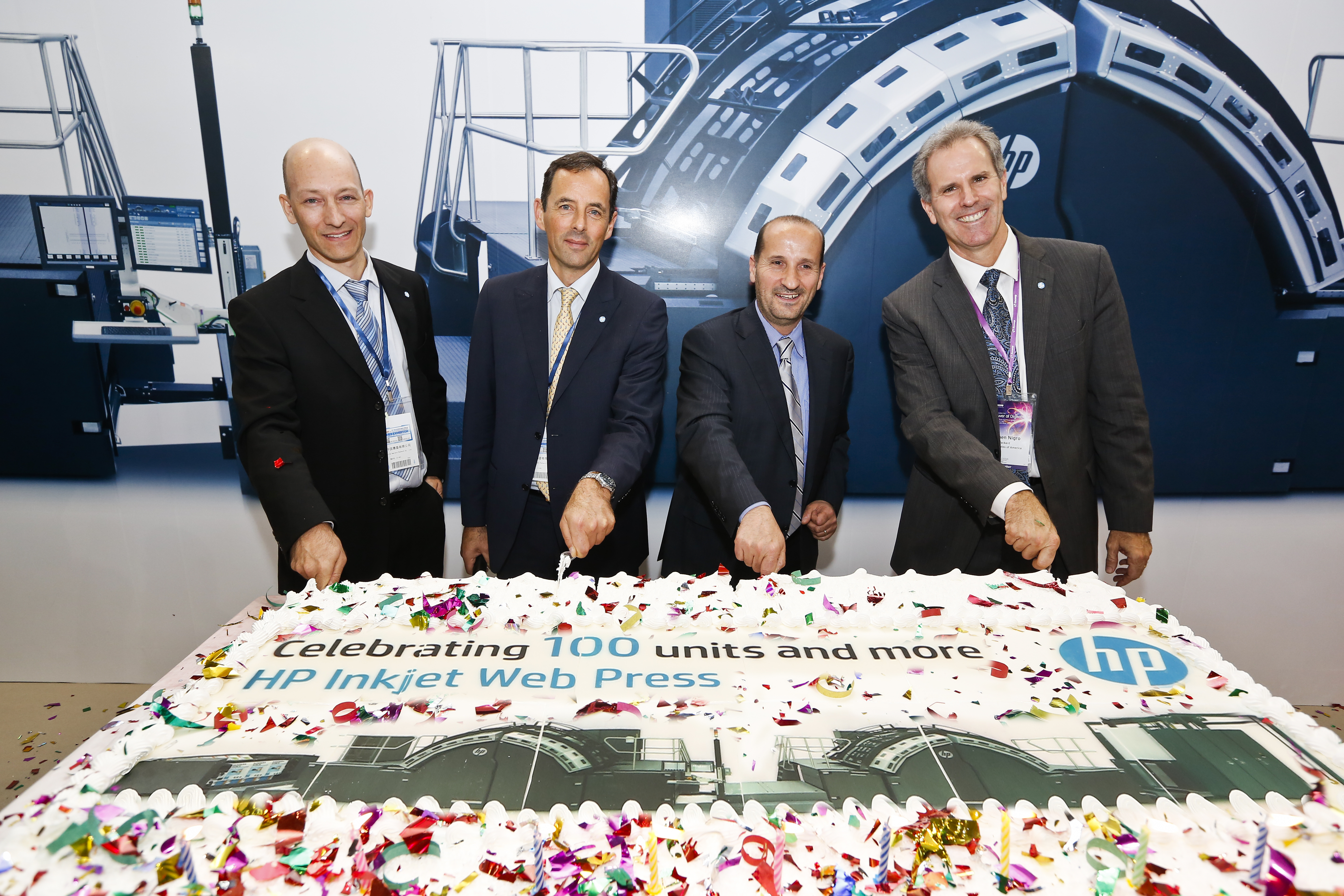 HP completed installation of 100 HP inkjet web presses worldwide at the end of January 2013. The top brass of HP celebrating the success