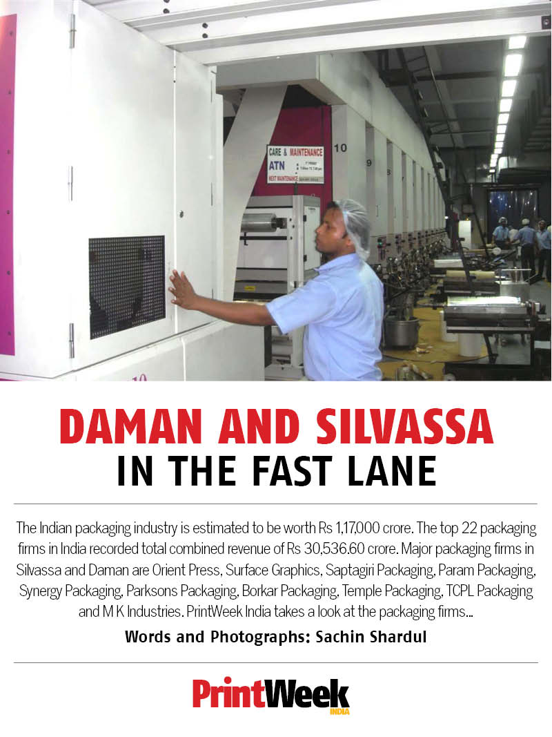 The Indian packaging industry is estimated to be worth Rs 1,17,000 crore. The top 22 packaging firms in India recorded total combined revenue of Rs 30,536.60-crore. Major packaging firms in Silvassa and Daman are Orient Press, Surface Graphics, Saptagiri Packaging, Param Packaging, Synergy Packaging, Parksons Packaging, Borkar Packaging, Temple Packaging, TCPL Packaging and M K Industries. Words and Photographs: Sachin Shardul