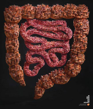 Zentel - Slums (Housing Colonies) for Worms by Medulla Healthcare Communications | While every other Indian suffers from worm infestation, most choose to ignore it. This was the challenge facing Zentel from GSK. To draw attention, Medulla decided to make people visualise worms in human intestines. A 10-foot installation of a ‘slum colony’ was created in the shape of an intestine involving 20 artists over three months. Miniature houses of 1 to 5 cm made up the slum, replete with the typical antennae, windows, et al. These were then converted into posters and print.