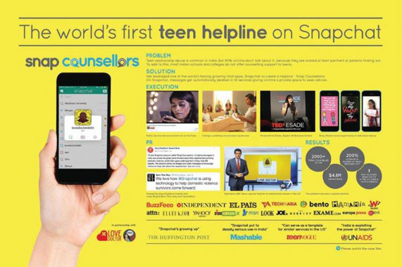 Snap Counsellors by TBWA\INDIA | This campaign married the unique attribute of a medium (Snapchat) with a real need among youth. On Snapchat, messages get deleted in 10 seconds, giving victims a discreet platform where they can talk to a counsellor. ‘Snap Counsellors’ was billed as the world’s first teen abuse helpline on Snapchat. It was created with LoveDoctor.in and Chayn India. It has since spawned similar helplines in other countries.