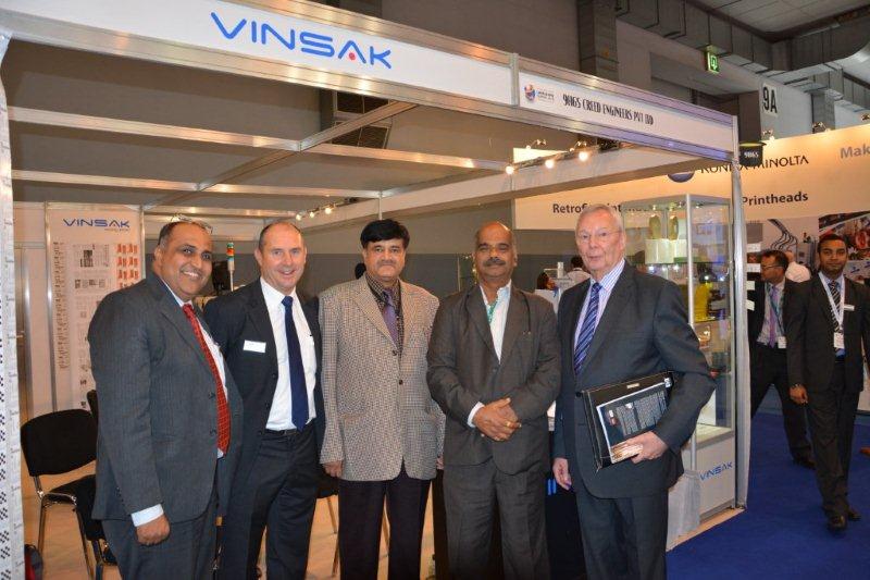 Ranesh Bajaj (l) with team Tarsus and LMAI. Vinsak made its Labelexpo debut with solutions for anti-counterfeiting, which it claims is a “unique solution to implement multi-layer security” on labels.