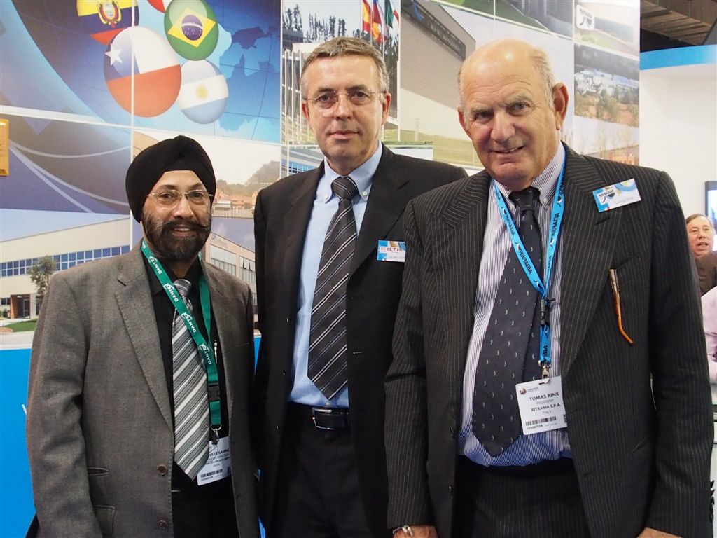 At Labelexpo, Harveer Sahni (l) of Weldon Celloplast engaged in a quick chat with Tomas Rink (r), president, Ritrama Group and Tarcisio Scapinelli, president and CEO, ILTI to discuss and decode core linerless solution technology