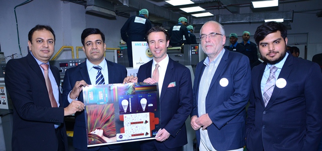 Vijay Adlakha of Infinity and team members from APL Mechinary and AMS display a printed sample on PVC MetPet 200 micron polycarbonate sheet. The job was produced through five colour printing