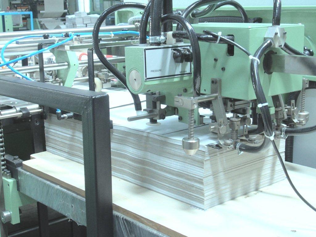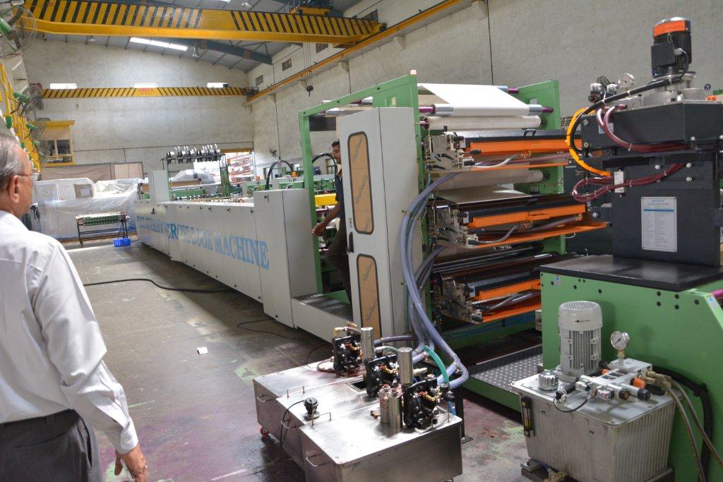 Hirpara showcasing the perfectly back-squared exercise book. The folding and back-squaring (perfect-bind like) section of the machine. The back-squaring system has been automated following customer feedback. Earlier this was done manually