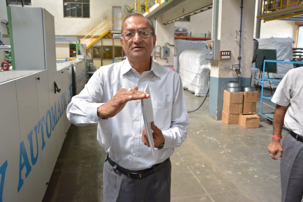 Hirpara pointing at the stitching unit attached to the exercise book making machines. There are 12 overhead pin rolls feeding pins to the stitching heads from Hohner, Germany. Depending upon the number of ups, the number of pins units are engaged