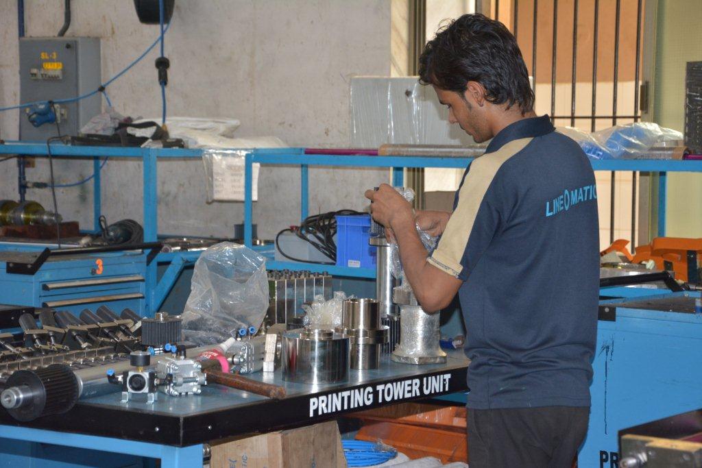An employee working on the printing tower unit