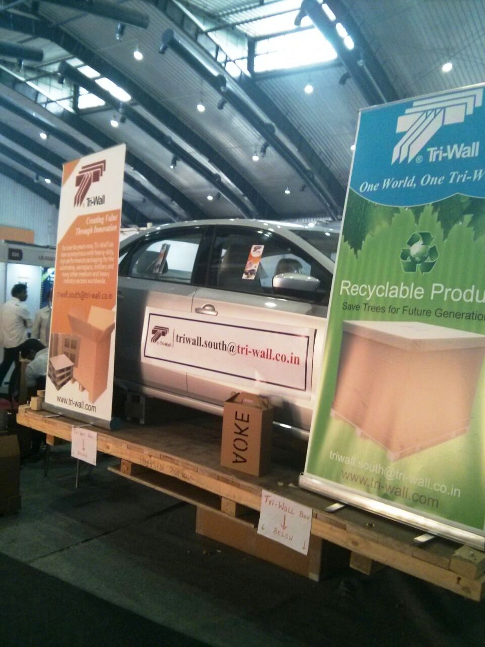 A car being balanced on the humble brown box from Tri Wall who supply from locations in Chennai, Bengaluru, Pune, Delhi and Hyderabad.