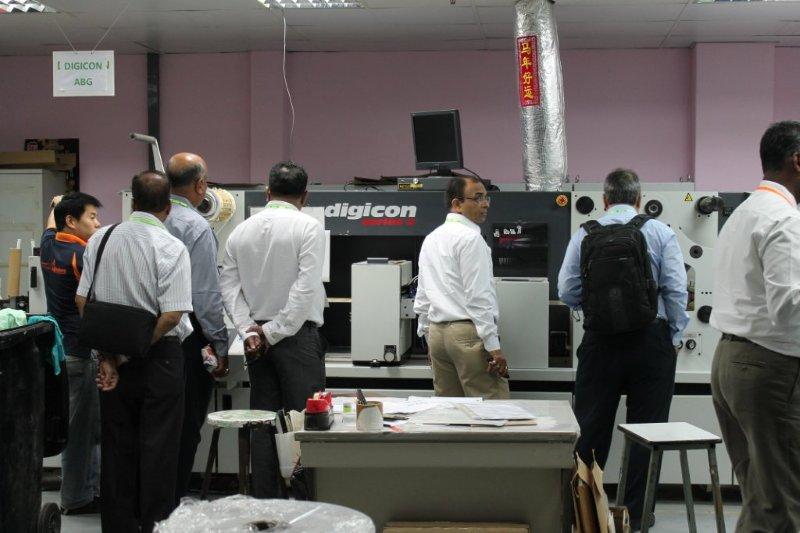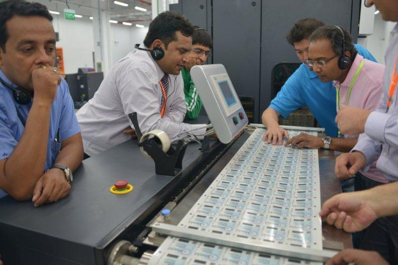 Demonstration of HP Indigo WS Series digital label printing press. The BMPA delegation taking a close look a the micro-text and high-end security features the WS Series is capable of