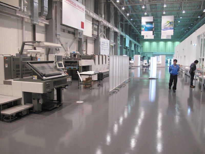 A gallery of Komori offset presses at the Komori Graphic Centre in the ultra-modern Tsukuba plant. The plant produces seven presses a day, 3,500 presses per annum and using Kaizen principles. The assembly line moves at 7-cms per minute and is a multi offset press assembly line. Komori presses use the same quality of bearings that go into manufacturing a bullet train.