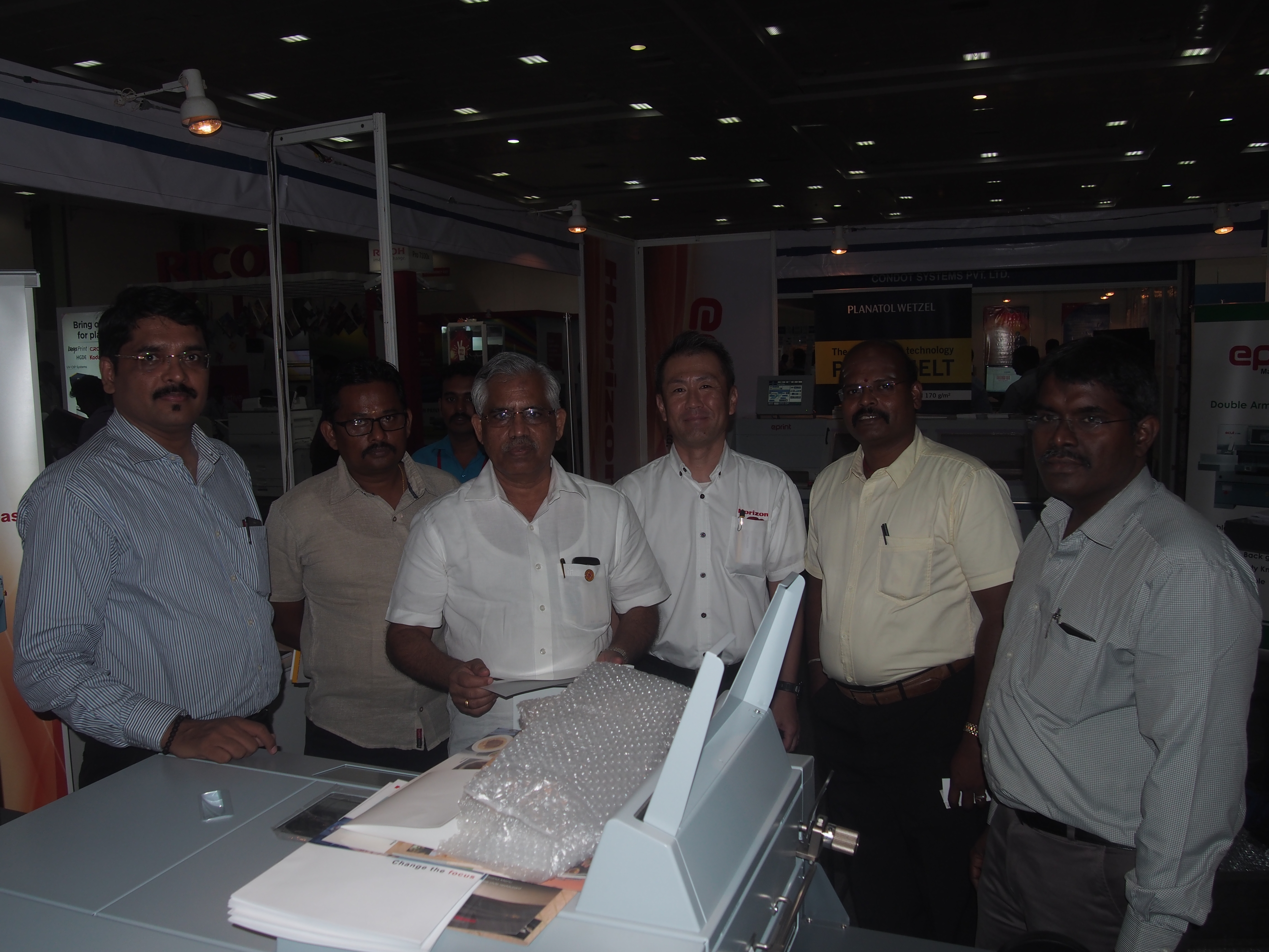 One of the busiest stalls in this year's event were the debutants ePrint Machinery, who along with their principals from Horizon did good business and were seen happily interacting with one and all from the industry. O Venugopal of Anaswara Offset seen posing with ePrint and Horizon team. The company also launched their cutting system eCut at the show