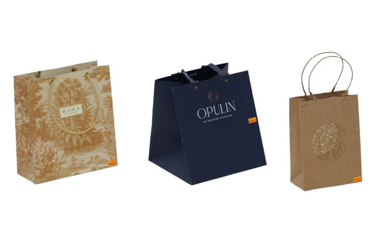 Their duplex board small carry bag for ARQ Providers incorporated multiple post-press treatments, including gloss varnish, matte lamination, gloss leafing, embossing, die-cutting, stripping, bag-making, and eye-letting, with a golden cotton thread as a notable feature. The Opulin Blue carry bag for LA Niche, printed on both sides, featured a prominent blue colour and blue ribbon handles.