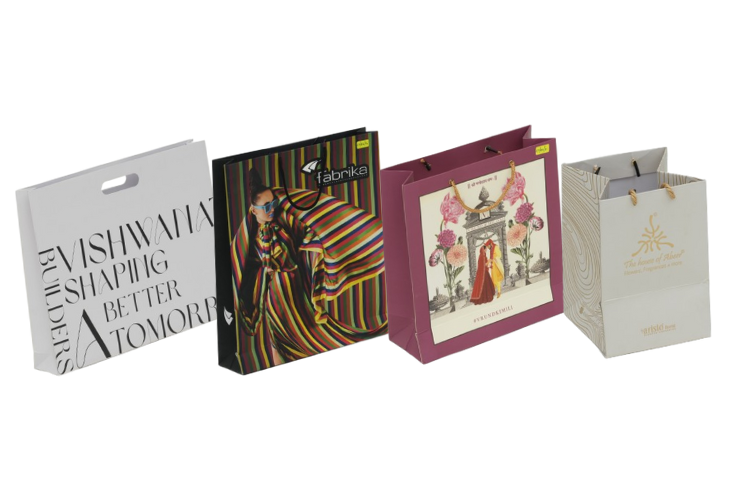 For The House of Abeer, a metallic gold accent was applied, contributing to a sophisticated aesthetic. Bags for Vishwanath Builders presented a minimalist design with a clean white background, distinguished by punching on the top for the handle and enhanced by precise printing, a matte finish, and expert pasting.