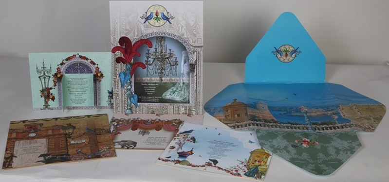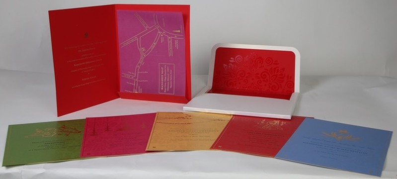 The wedding card for the granddaughter of the Maharaja of Jammu & Kashmir for the client Benchmark Graphics was screen-printed on various papers from Sona Papers, and featured finishing such as die-cutting, foiling, edge gilding, tone on tiny printing, UV by screen, metal prototyping and so on. The print run was 800