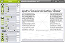 Designers can use the app on their touchscreen devices to customise designs for products such as posters, business cards, brochures and postcards on pre-defined layouts set out on a visible, removable grid (to aid the design process).