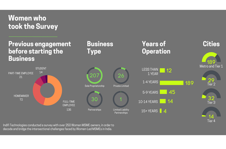 Women entrepreneurs displayed a fair sense of comfort in using digital tools and the top use of digital technologies in their businesses was for internet banking, followed by social media marketing and using online marketplaces. In Indifi’s own findings from its customer base, 50% of the loans for women SMEs come from eCommerce, travel, and restaurant segments which heavily rely on digital technology for their operations.