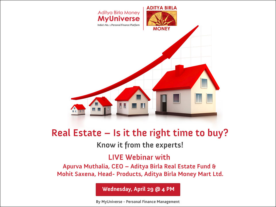 MyUniverse presents a webinar on one of the most important decision making aspect of whether one should invest in Real Estate now? Is this the right time to invest in Real Estate? The webinar will answer all the questions on Real Estate Investments from Industry Experts Mr. Apurva Muthalia - CEO Aditya Birla Real Estate Fund & Mohit Saxena - Head - Products, Aditya Birla Money Mart on 29th April'15 at 4:00Pm IST
