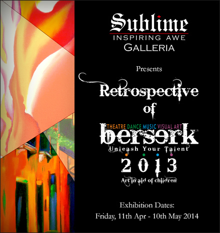 This exhibition is a labour of love by the children and their artistic journey through Berserk. Come, enjoy this surrealistic experience which is bound to lift your spirits! Witness Retrospective of Berserk from the 12th April '14, at Sublime Galleria, 8th Floor, Sky Bridge at UB City, Bangalore. The exhibit will remain on display till 10th May '14.