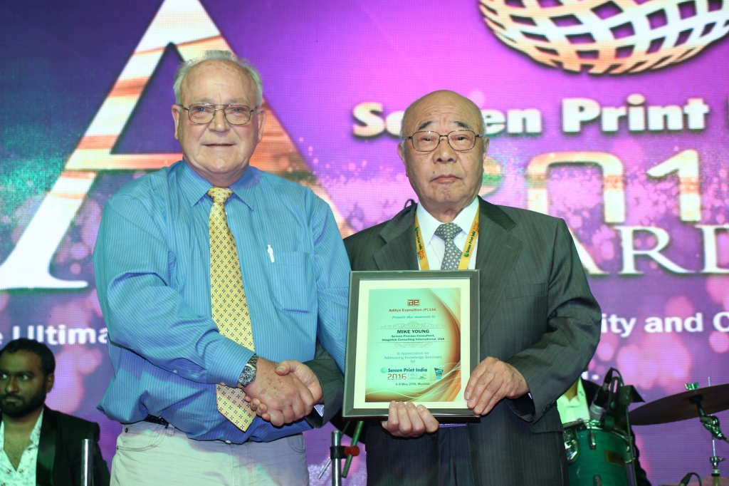 Mike Young was felicitated by Yuichi Nishida during the Screen Print India Awards night