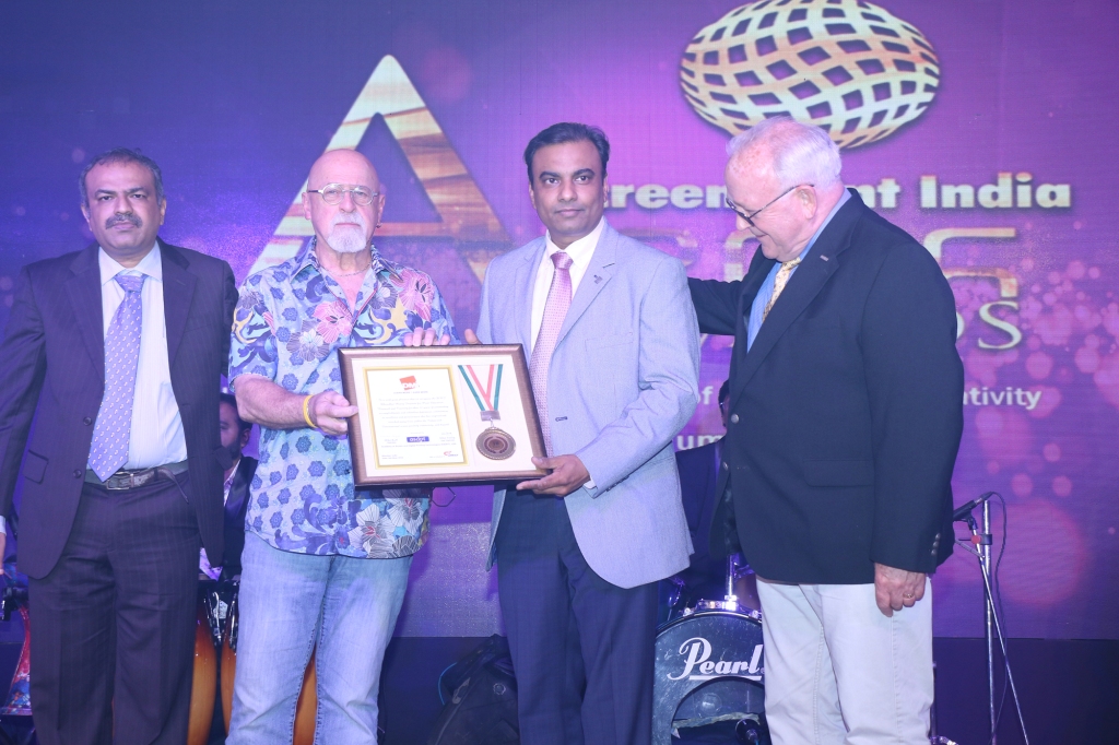 (From left): Devang Sheth, managing director at Aditya Expositions, Charlie Taublieb, Bhargav Mistry, managing director at Grafica Flextronica receiving the award along with Mike Young