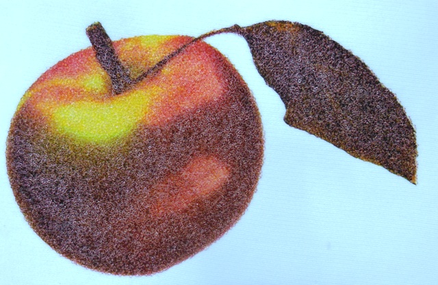 The image has six colours and is printed onto the substrate after which the beads are pasted onto the ink and cured