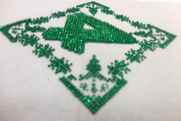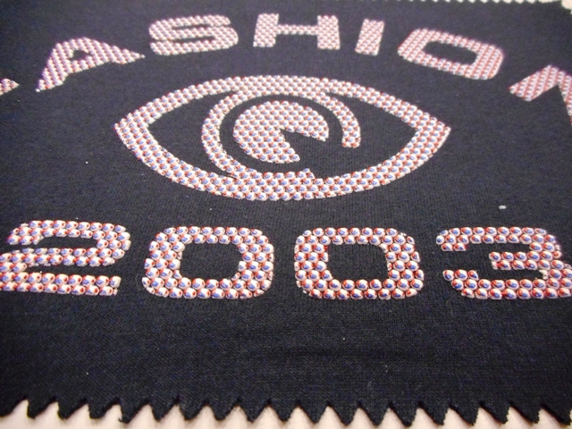 The image shows a high density glitter print. The high density inks used here is screen printed for five times. Finally, glitter is printed onto the print and cured