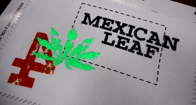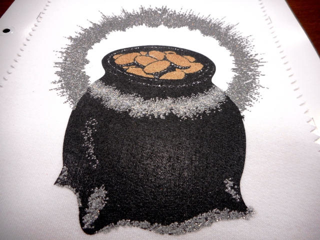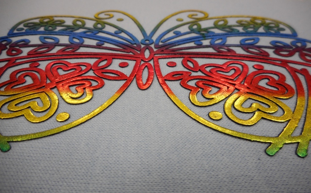 The foil effect is achieved by water-based Texiscreen aqua ink, After which a Metatran foil adhesive is printed and cured onto which foil paper is placed and fused