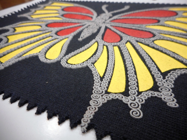 The high density raised print effect achieved by three colours printed onto the textile with Sericol's ink