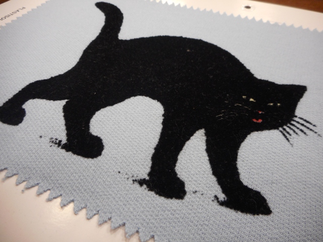 Print process: After the three base colour is printed, black flock powder is applied in a flocking machine. Past which print is cured