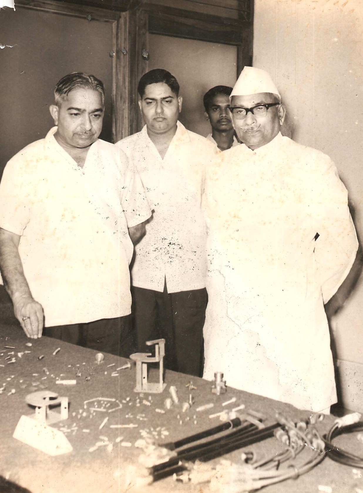 Marathe (l) demonstrating Swifts-manufactured automobile parts to Seth Lalchand Hirachand Doshi (r)
