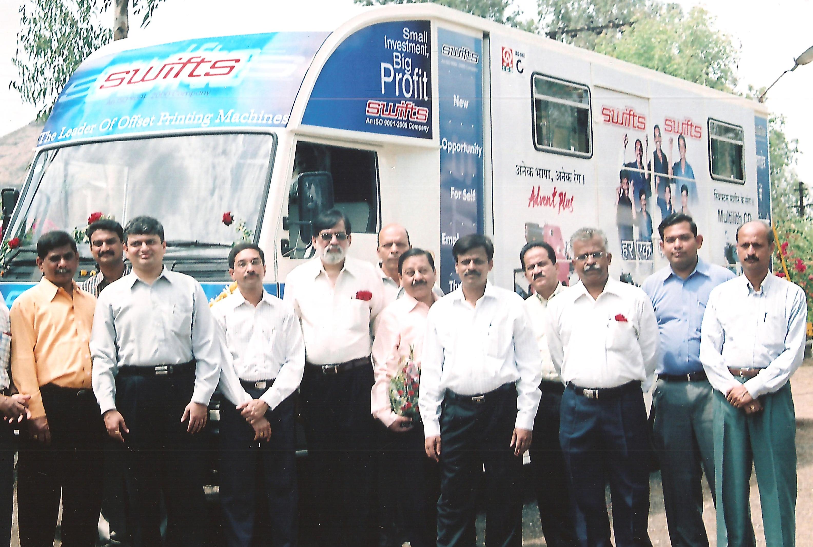 After a spell of over 34 years, Swifts re-opened its ancillary division and became an OEM supplier for Goss International. Swifts team with the technical team of Goss International in 2006. At the centre is Vasant Marathe, the third generation in the family