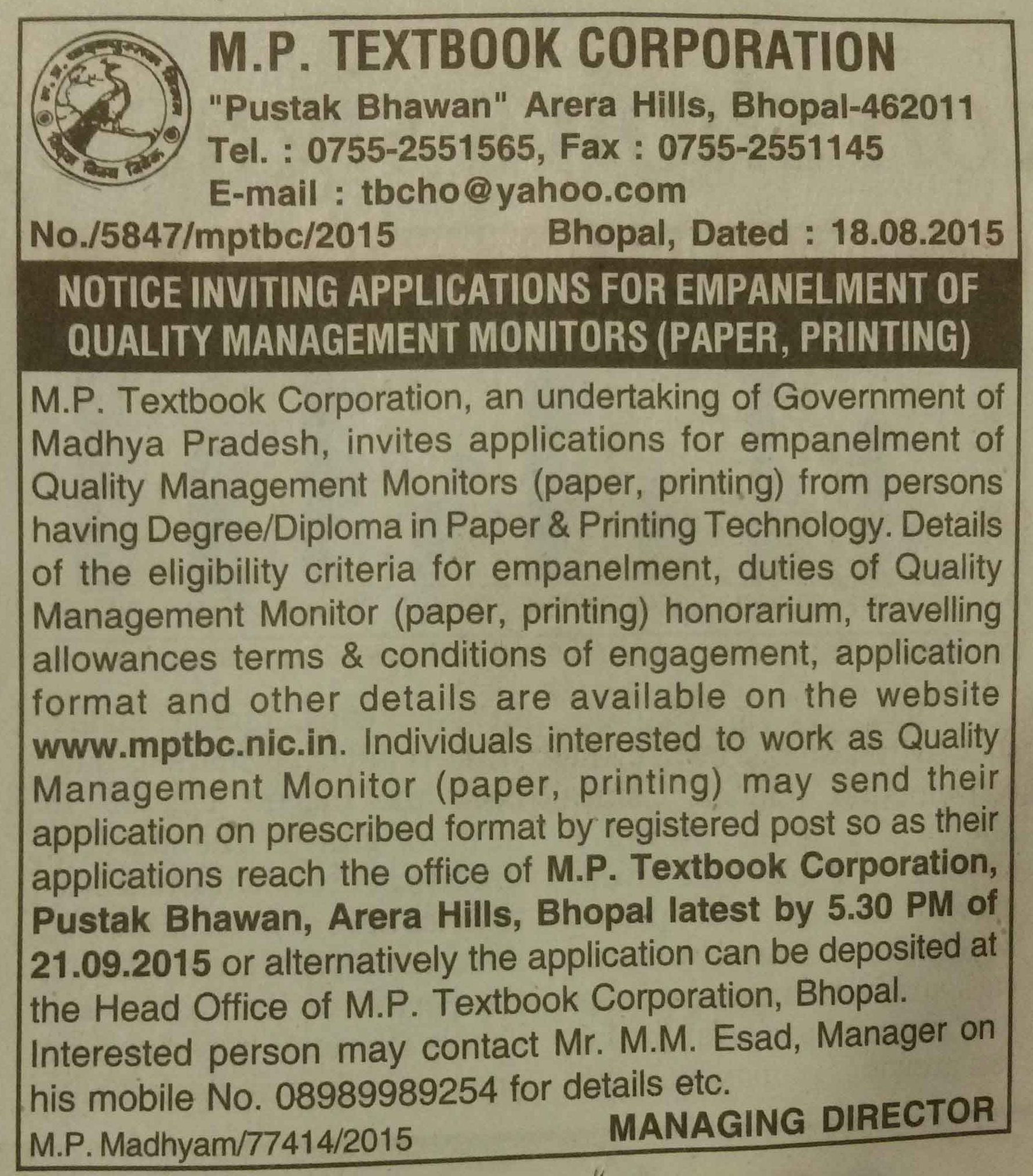 The details regarding the eligibility criteria for the empanelment, duties of quality management monitor (paper and printing), honorarium, travelling allowances, terms and conditions for the engagement, application format and other details are available on the website www.mptbc.nic.in.