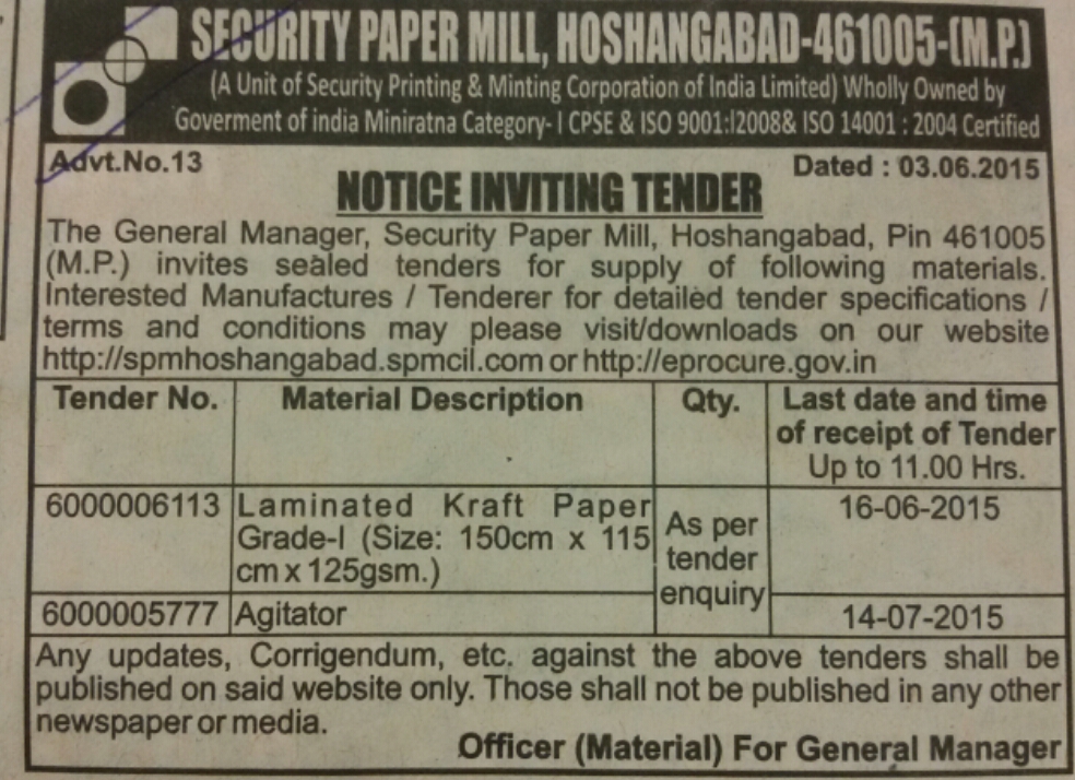 The time and date of opening the tenders is 16 June 2015 at 3:00pm at the Security Paper Mill, Hoshangabad. Rajkumar R, officer (Material) is designated to receive the tenders.