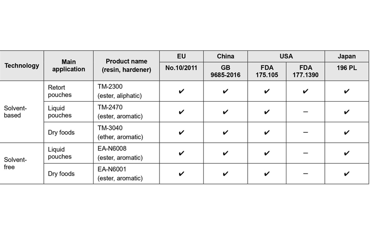 The TM-2300 aliphatic system is suitable for high-temperature retort pouch laminating structures according to US FDA 177.1390.