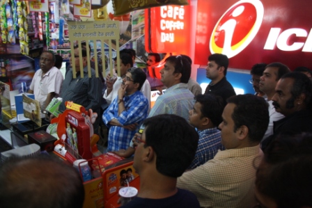 Amit Shah standing in the kirana shop created at the Bazaar and provides a first-hand experience of the POPs created by Spectrum Scan