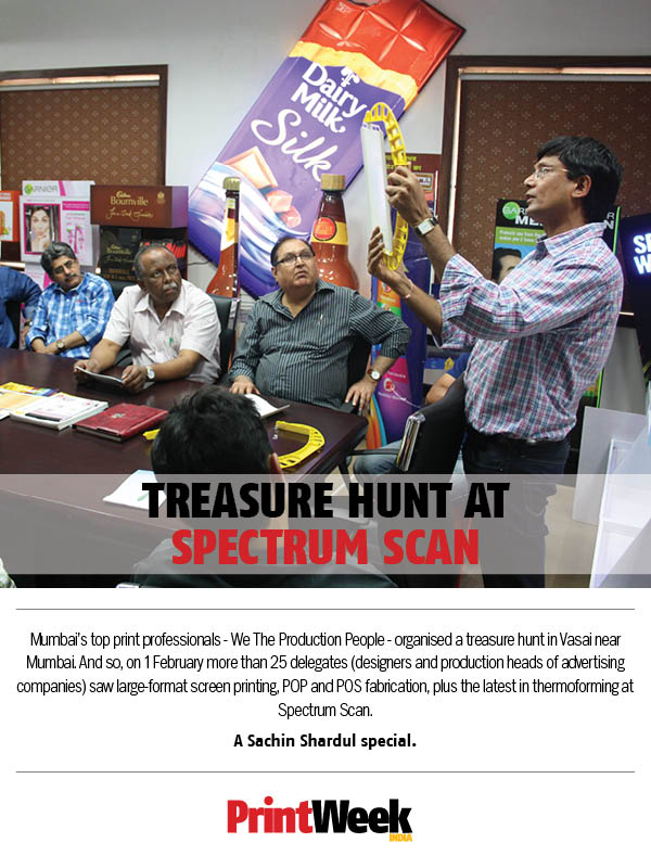 Mumbai's top print professionals - We The Production People - organised a treasure hunt in Vasai near Mumbai. And so, on 1 February more than 25 delegates (designers and production heads of advertising companies) saw large format screen printing, POP and POS fabrication, plus the latest in thermoforming at Spectrum Scan. A Sachin Shardul special.