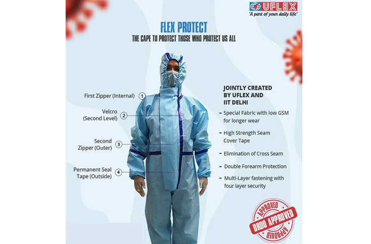 Flex Protect coverall: Uflex developed the Flex Protect PPE coverall in collaboration with IIT Delhi approved by DRDO, to enhance safety of frontline workers fighting the Covid-19 pandemic. Flex Protect Coverall meets the inadequacies of the conventional PPE coveralls with its anti-microbial coating and four layer security seal to protect against the virus and allows better breathability.