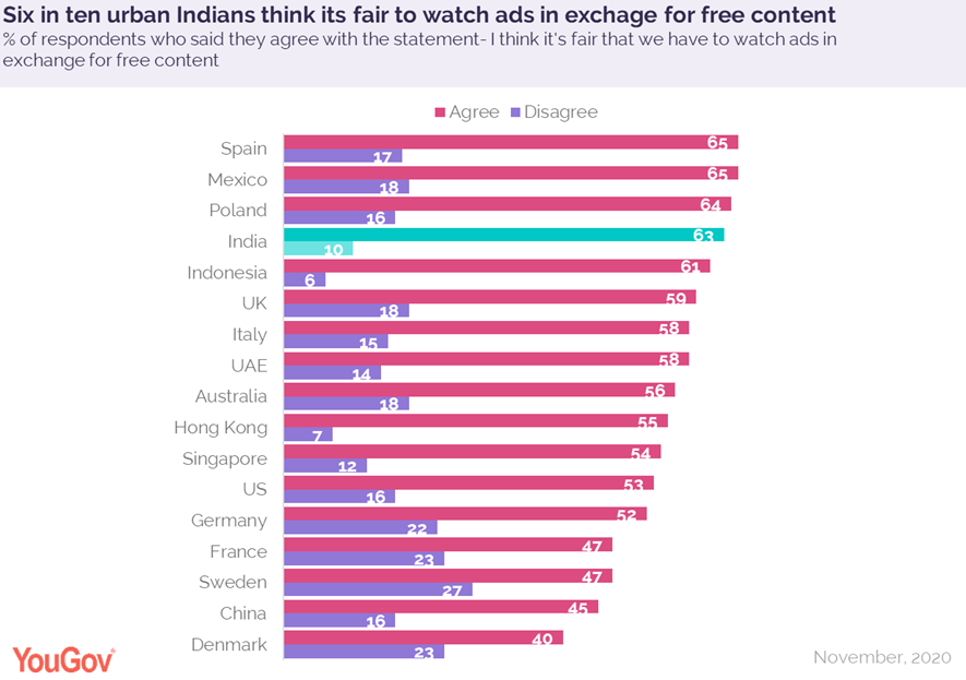 Across the globe, a plurality of consumers in the 17 markets favour the idea of watching advertisements in exchange for free content. Along with India, countries such as Mexico (65%), Spain (65%) and Poland (64%) highly favour this idea.