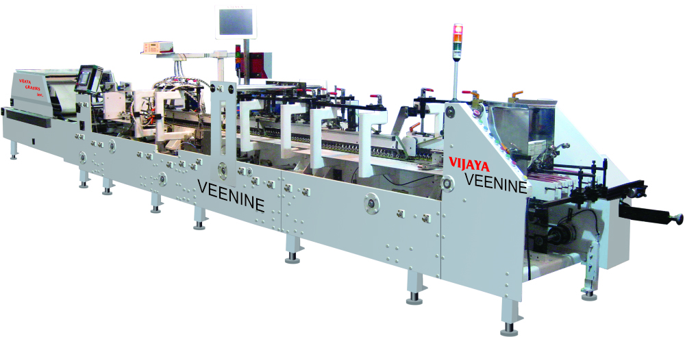 Vijaya-Veenine, the end-of-the-line crash lock bottom carton folding-gluing machine has been designed for smooth running of carton at high speed and to minimise wastage and easy makeready. For folding all lock flaps, the machine has been designed in three-track system, so that the cartons remain under pressure of two tracks at the time of folding of lock flap. This prevents shifting of alignment of cartons, saves wastages and increases speed. Special attachments can be added according to customers’ requirement.