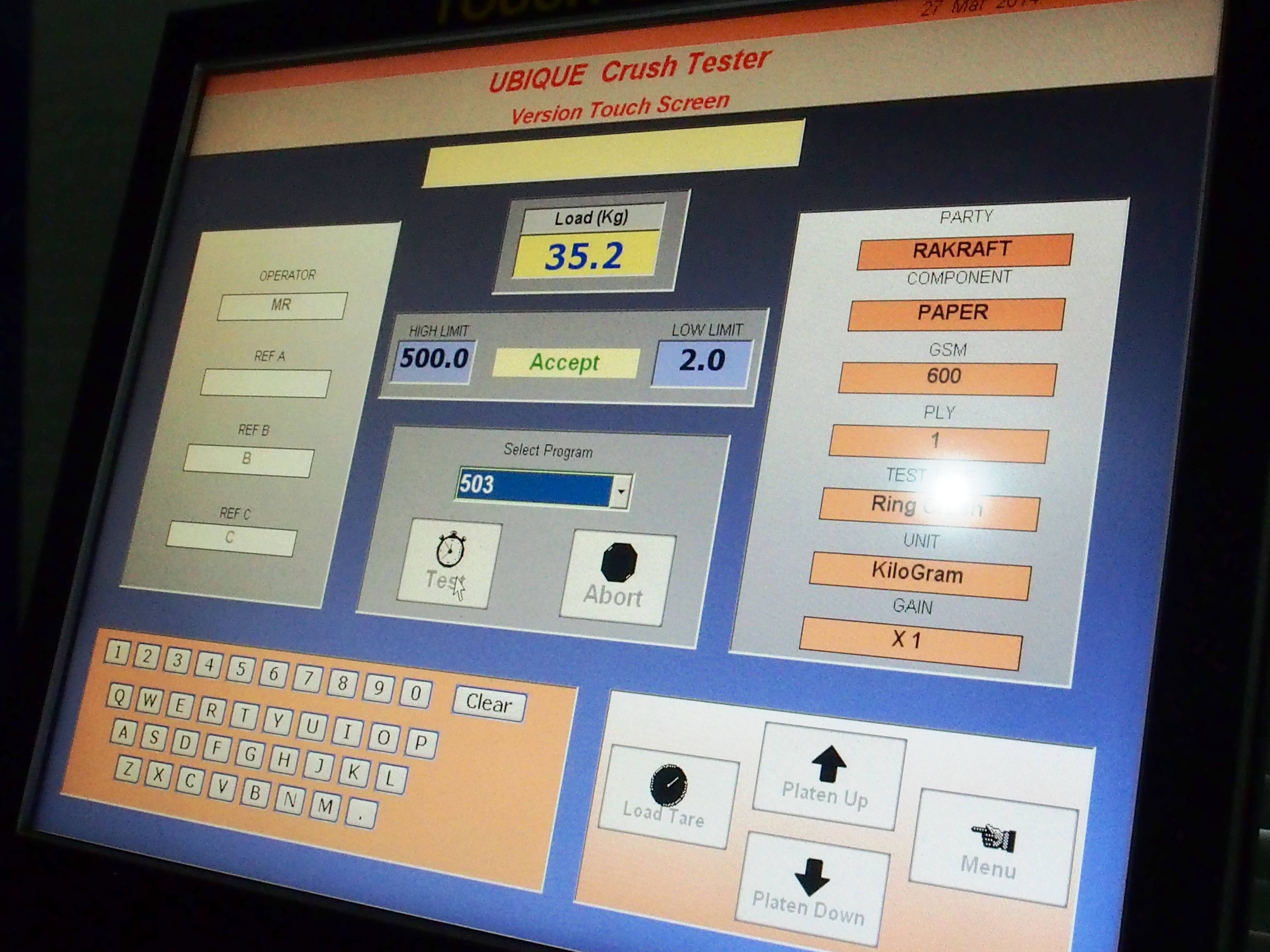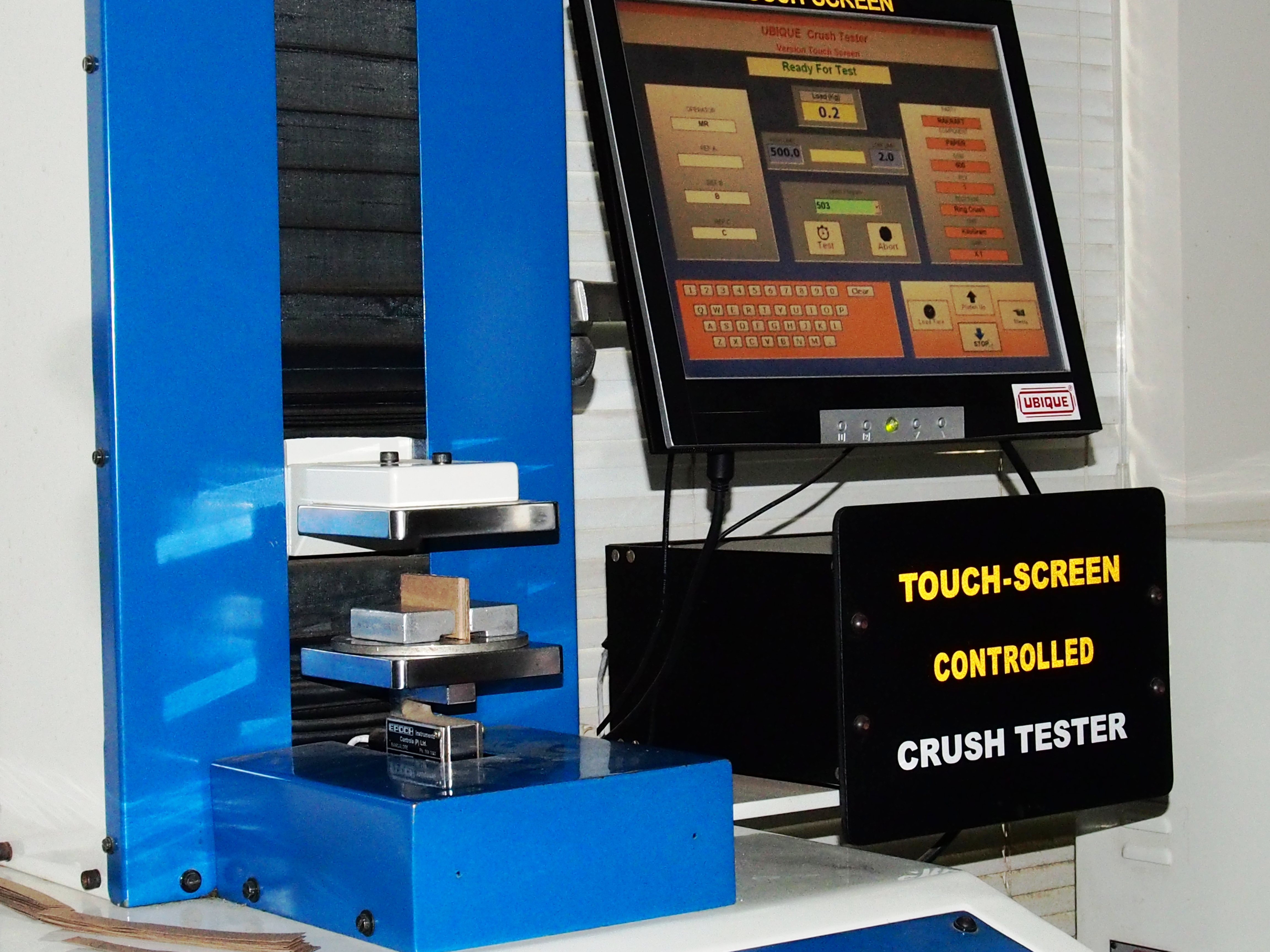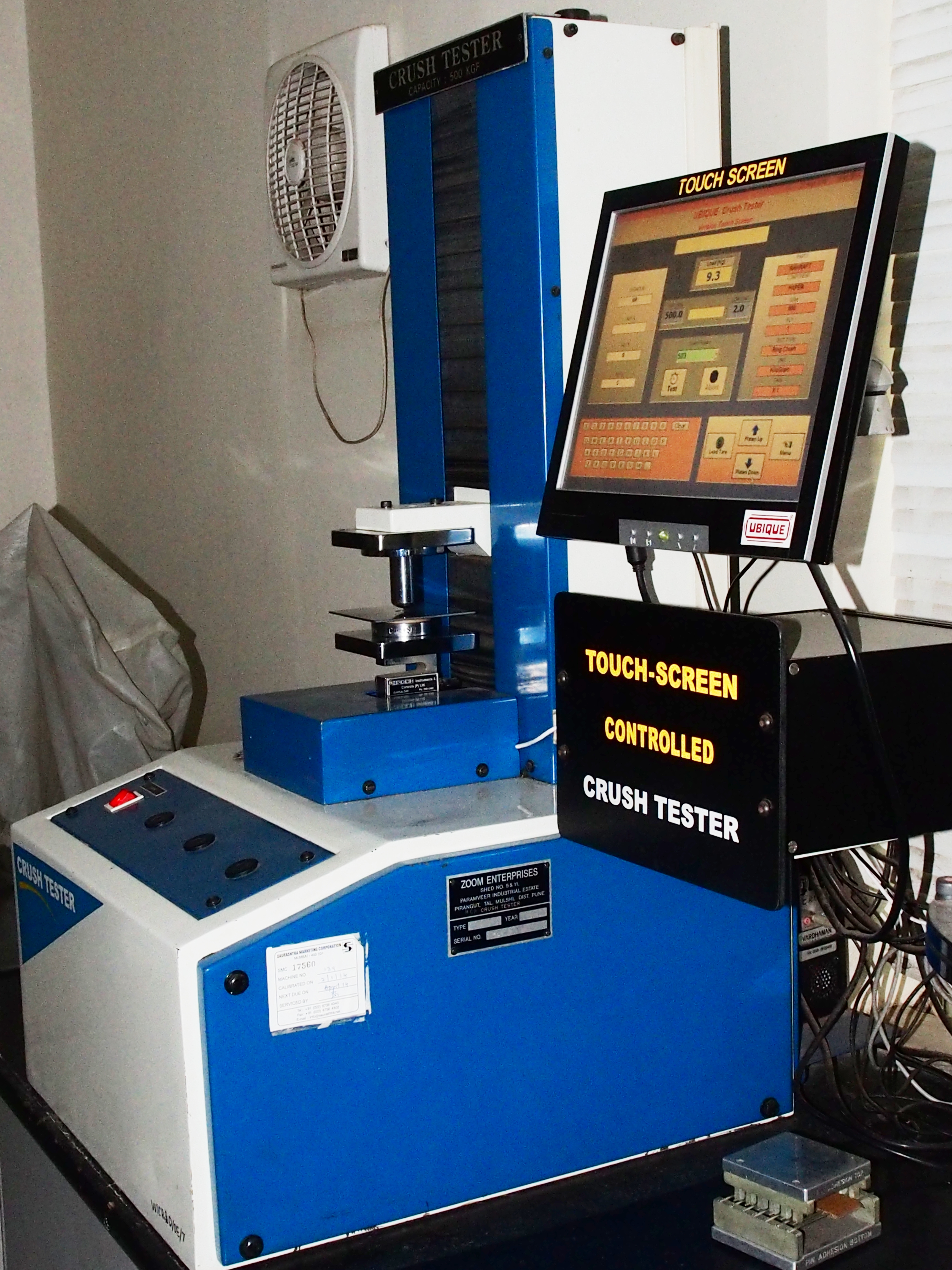 In the picture is a puncture resistance test in progress. It measures the energy required to punch through a corrugated board.