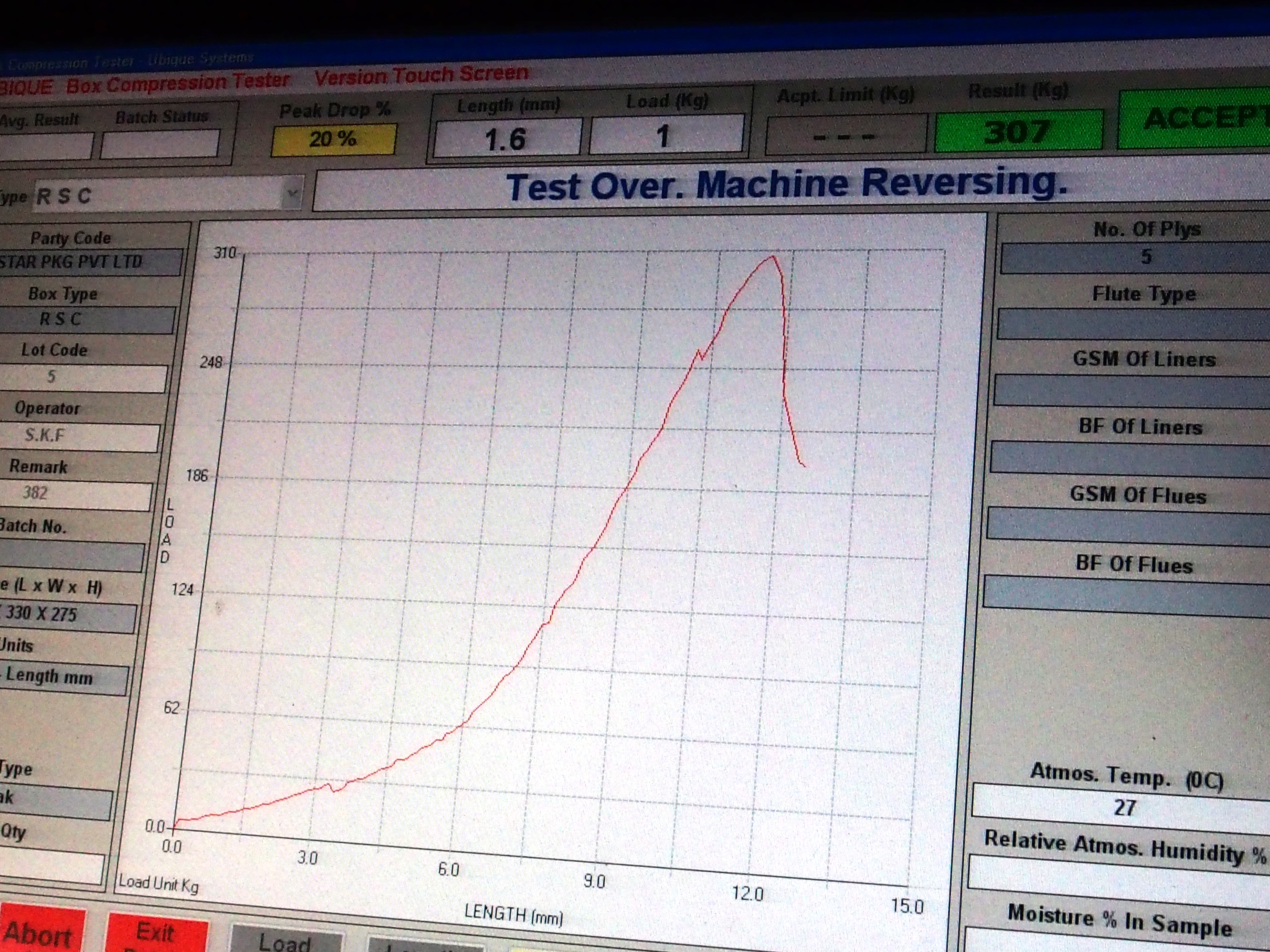 As the upper platen of the BCT tester gradually lowers, the load on the box placed between two platens increases until a peak point, which indicates the maximum load that the box can withstand.
