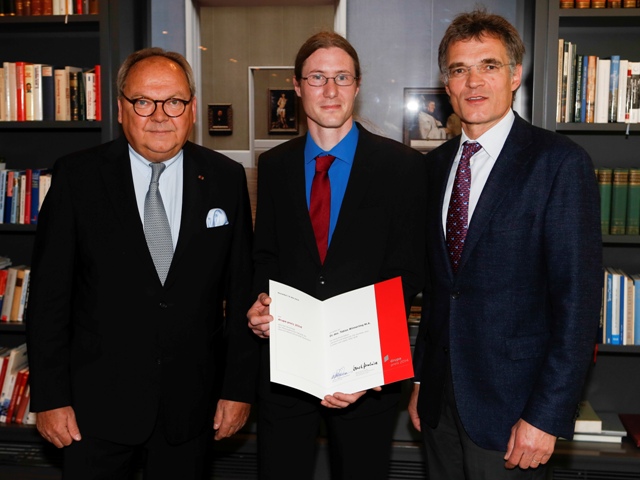 The prize was presented by Claus Bolza Schünemann, chairman of the executive board of Koenig & Bauer AG and president of the Drupa exhibitors’ advisory board 2016, Werner M. Dornscheidt, president and CEO of Messe Düsseldorf and Prof Dr H Michael Piper, president of Heinrich Heine University Düsseldorf during an awards ceremony at the Industry-Club Düsseldorf on 19 May.