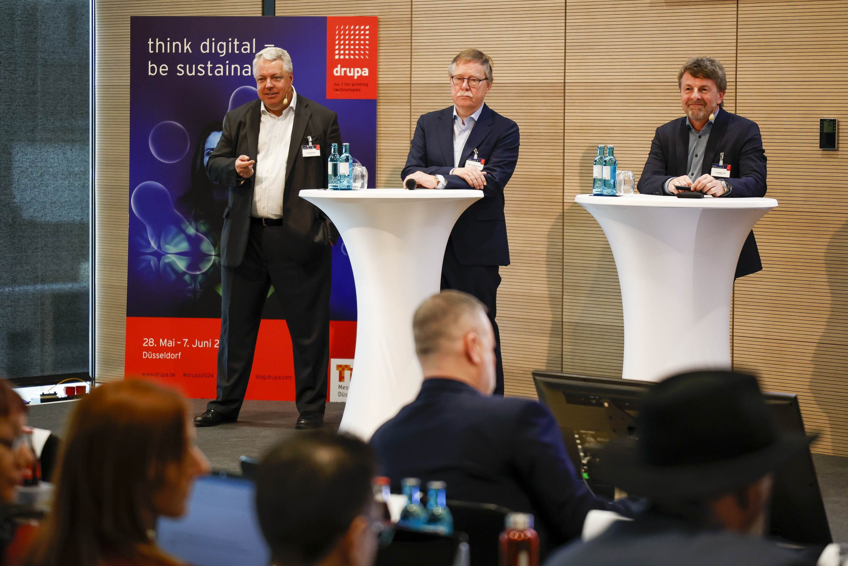 Opening the three-day Pre-Drupa International Media Conference Erhard Wienkamp, managing director of Messe Düsseldorf, welcomed the journalist in a roundtable discussion with Messe Dusseldorf Drupa team members, Dr Andreas Pleßke and Sabine Geldermann.