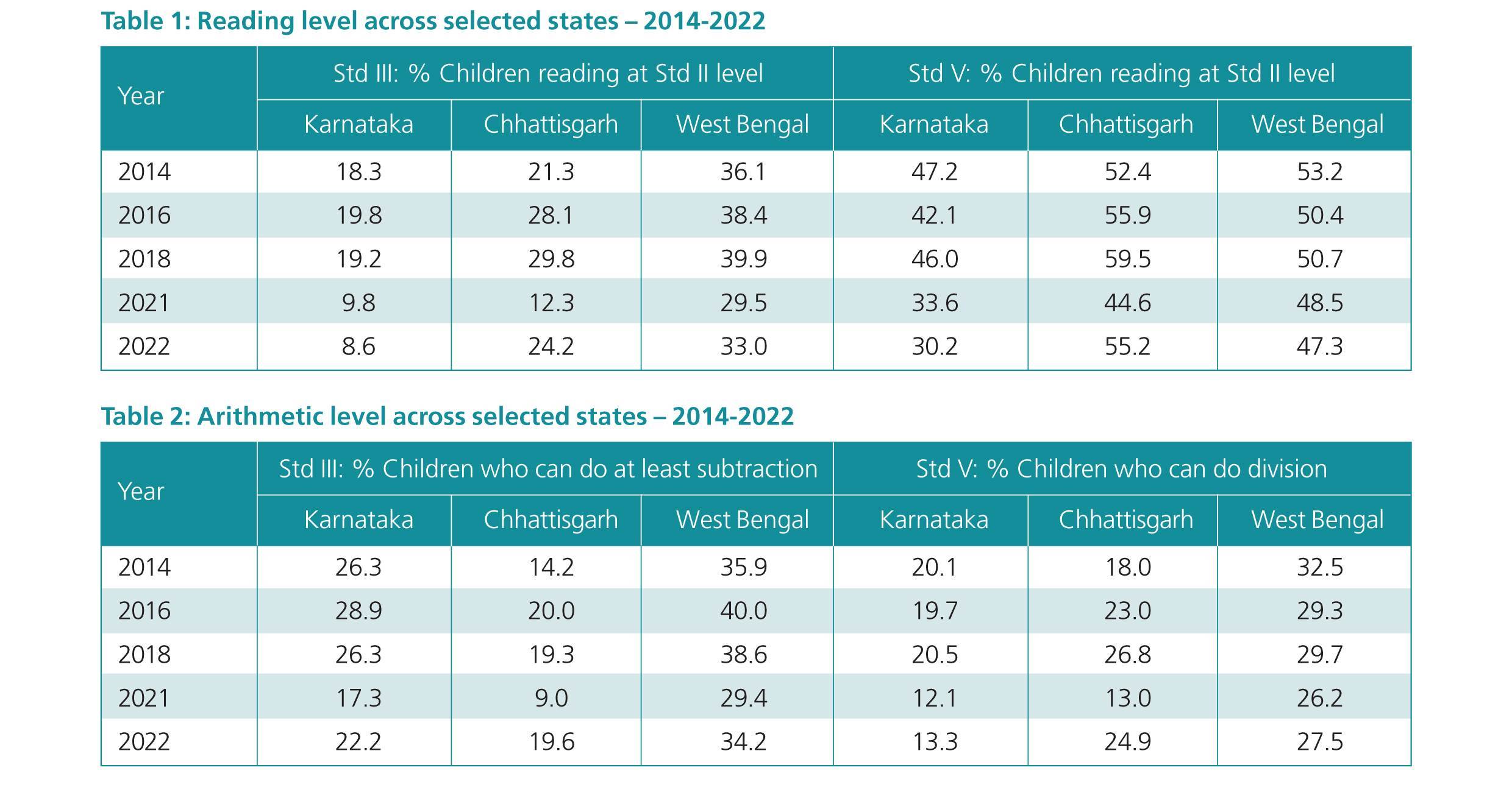 - Maharashtra saw a steady decline from 2018 to 2022 in students’ reading and arithmetic skills.