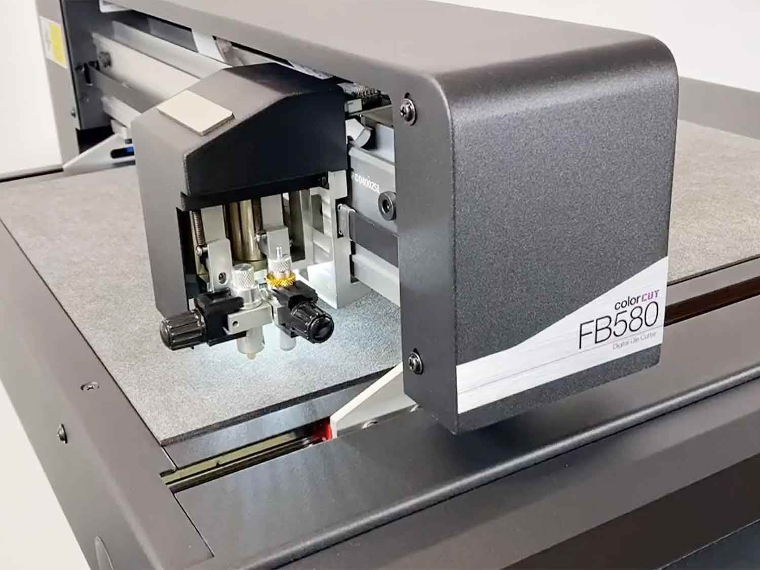 The ColorCut FB580 has a maximum substrate area of 440x580mm, and the operator can adjust its three-speed forces to accommodate intricate cutting or cutting straight lines fast. The software features QR codes, page marks, and a reverse side-cutting feature that reads the sheet edges. The device has a "no wires" option for repeat jobs that can be loaded via a USB stick.